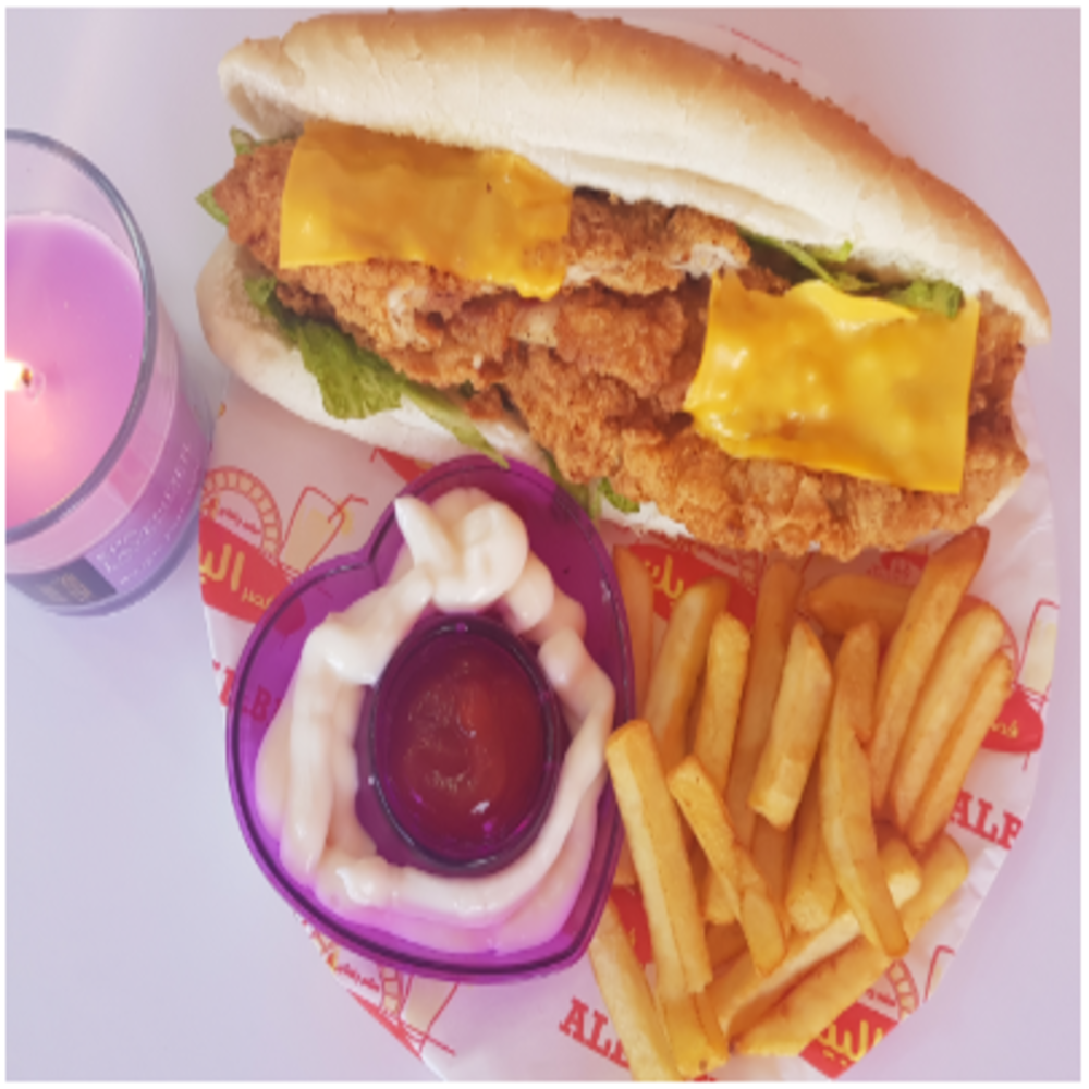 فيليه دجاج, شريحة جبنة, مايونيز, خس, بطاط و مشروب غازي