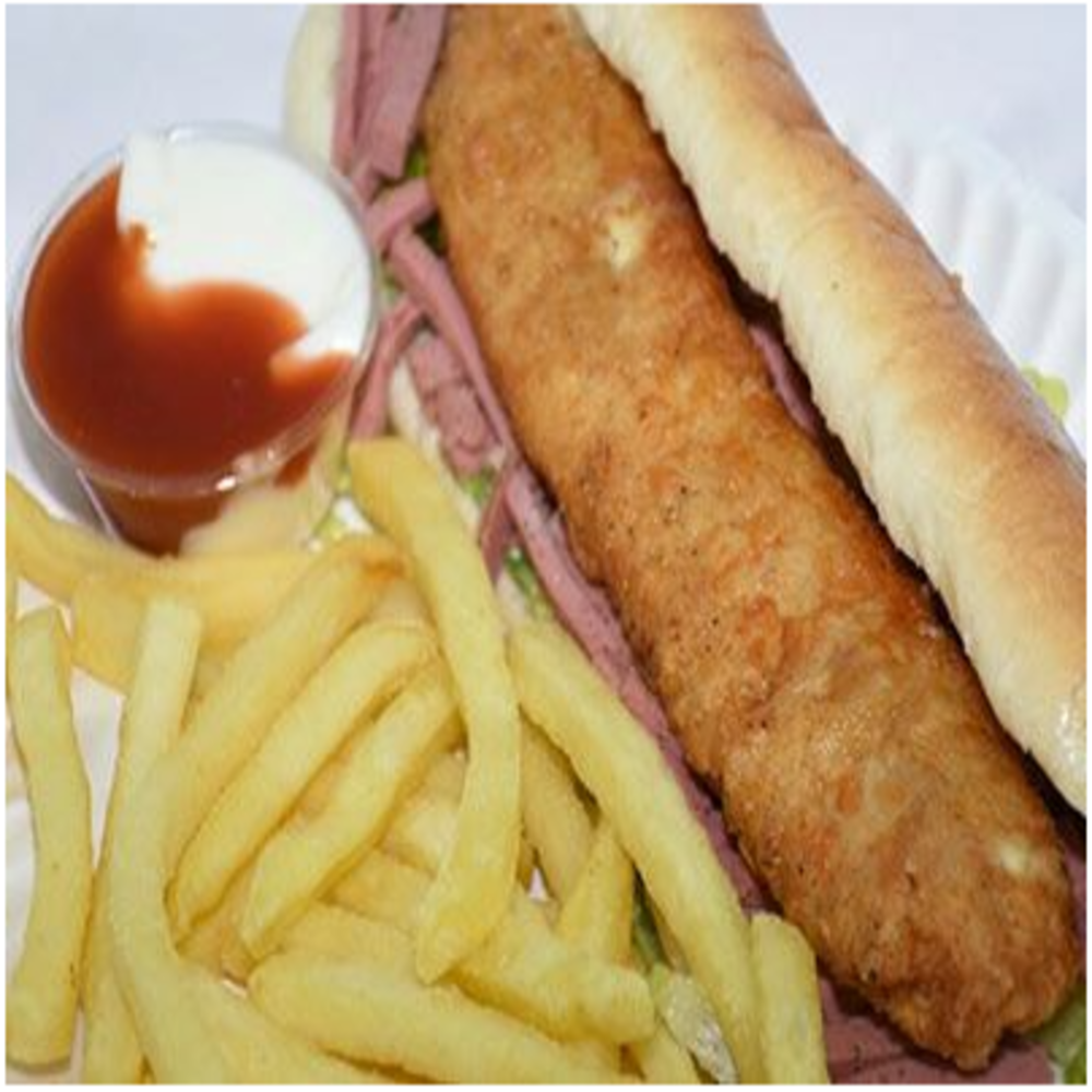 لفائف فيليه، جبنة موزاريلا وجبنة كرافت يقدم مع بططا مقلية ومشروب غازي.